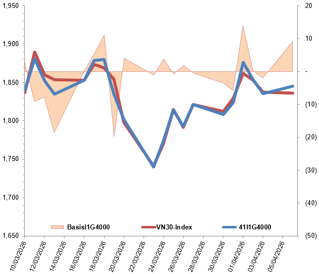 Kết phiên, basis hợp đồng I1G4000 đảo chiều so với phiên trước đó và đạt giá trị 9.05 điểm. Điều này cho thấy tâm lý nhà đầu tư đã lạc quan trở lại.