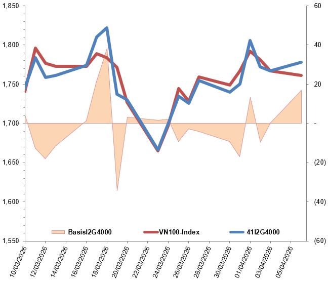 Ngoài ra, các hợp đồng tương lai VN100 hầu hết đều tăng trong phiên giao dịch ngày 06/04/2026. Cụ thể, 41I2G4000 (I2G4000) tăng 0.16%, đạt 1,777.9 điểm; 41I2G5000 (I2G5000) tăng 0.14%, đạt 1,767.5 điểm; hợp đồng 41I2G6000 (I2G6000) dừng tại mốc tham chiếu, đạt 1,763.5 điểm; hợp đồng 41I2G9000 (I2G9000) tăng 0.08%, đạt 1,760.1 điểm. Chỉ số cơ sở VN100-Index kết phiên ở mức 1,760.97 điểm.
