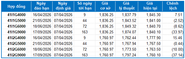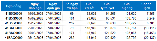 Dựa trên phương pháp định giá hợp lý với thời điểm khởi đầu ngày 07/04/2026, khung giá hợp lý của các hợp đồng tương lai đang được giao dịch trên thị trường được thể hiện như sau: