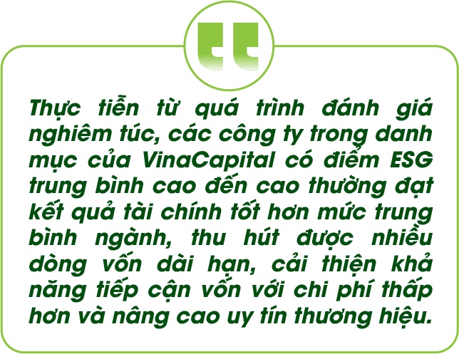 Thực tiễn từ quá trình đánh giá nghiêm túc, các công ty trong danh mục của VinaCapital có điểm ESG trung bình cao đến cao thường đạt kết quả tài chính tốt hơn mức trung bình ngành, thu hút được nhiều dòng vốn dài hạn, cải thiện khả năng tiếp cận vốn với chi phí thấp hơn và nâng cao uy tín thương hiệu.