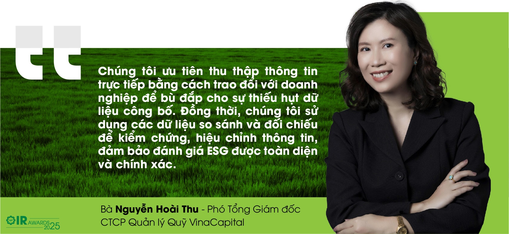 Thứ hai, đánh giá các công ty theo bộ tiêu chí ESG do VinaCapital xây dựng: Chúng tôi kết hợp dữ liệu công bố, thông tin thu thập trực tiếp và so sánh với chuẩn mực quốc tế để đánh giá.