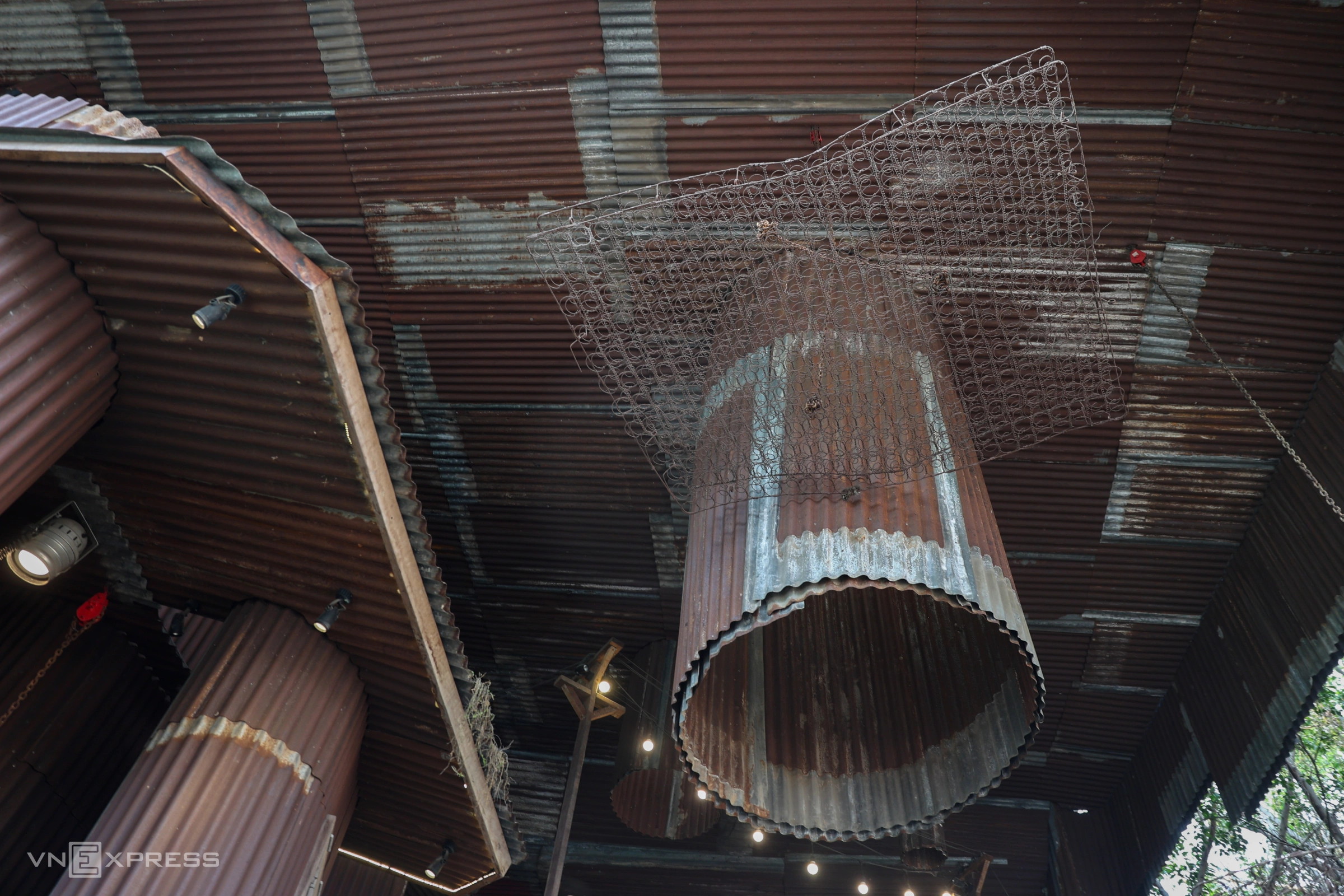 Quán cũng sử dụng nhiều tấm sắt để làm vách ngăn và trang trí trần. Những thanh kim loại này có nguồn gốc từ sân bay Phú Bài, TP Huế.