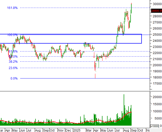 Ngưỡng Fibonacci Retracement 161.8% (tương đương vùng 29,000-29,500) đang đóng vai trò kháng cự mạnh trong ngắn hạn. Đây sẽ là thử thách lớn nhất của giá trong năm 2025. Nếu vượt qua ngưỡng này thì HPG sẽ hướng đến mục tiêu mới là vùng 36,000-36,500.