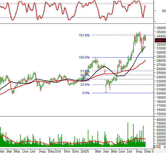 Giá cổ phiếu PAN giằng co và rung lắc trong phiên giao dịch ngày 05/09/2025 sau khi test lại hai kháng cự quan trọng là đỉnh cũ tháng 08/2025 (tương đương vùng 33,000-35,000) và Fibonacci Retracement 161.8%.