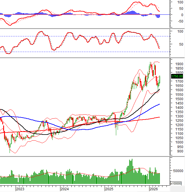 VN-Index phục hồi tuần thứ 3 liên tiếp và tiến sát đường Middle của Bollinger Bands. Đà tăng sẽ được củng cố vững chắc hơn nếu chỉ số vượt lên ngưỡng này kèm khối lượng giao dịch tiếp tục cải thiện và vượt mức trung bình 20 tuần trong thời gian tới.