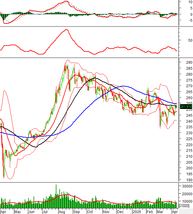 Trong khung thời gian tuần (06-10/04/2026), VN-Index tăng mạnh với cây nến xanh dài và tiến sát đường Middle của Bollinger Bands. Đà tăng sẽ được củng cố vững chắc hơn nếu chỉ số vượt lên ngưỡng này kèm khối lượng giao dịch tiếp tục cải thiện và vượt mức trung bình 20 tuần trong thời gian tới.