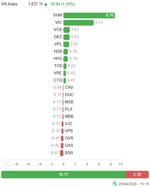 – Về mức độ ảnh hưởng, 10 mã có tác động tích cực nhất đem về gần 20 điểm tăng cho VN-Index, trong đó riêng bộ đôi VHM và VIC đã chiếm gần 14 điểm. Ở chiều ngược lại, BSR, GAS và GVR là những mã gây áp lực nhiều nhất, nhưng cũng chỉ lấy đi tổng cộng 1.43 điểm của chỉ số.