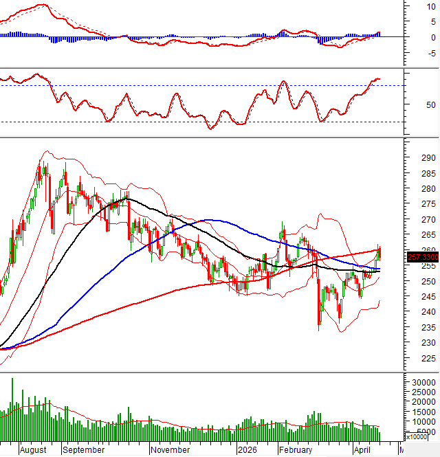 VN-Index quay lại đà tăng và tiến sát Upper Band của Bollinger Bands. Tuy nhiên, khối lượng giao dịch tiếp tục sụt giảm mạnh dưới mức trung bình 20 phiên cho thấy tâm lý nhà đầu tư vẫn trong trạng thái thận trọng. Bên cạnh đó, chỉ báo Stochastic Oscillator đã cho tín hiệu tiêu cực trong vùng quá mua nên hiện tượng rung lắc có thể gia tăng trong các phiên tới.