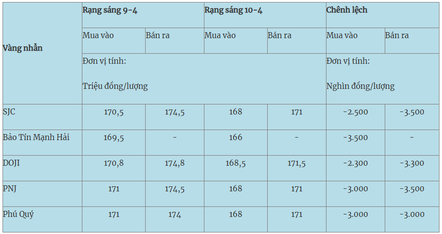 Giá vàng hôm nay (10-4): Giá vàng miếng SJC trong nước giảm mạnh trong 24 giờ qua, bán ra ở mức 171,5 triệu đồng/lượng. Trong khi đó, giá vàng thế giới tăng hơn 15 USD/ounce, giao dịch ở mức 4.767,5 USD/ounce.