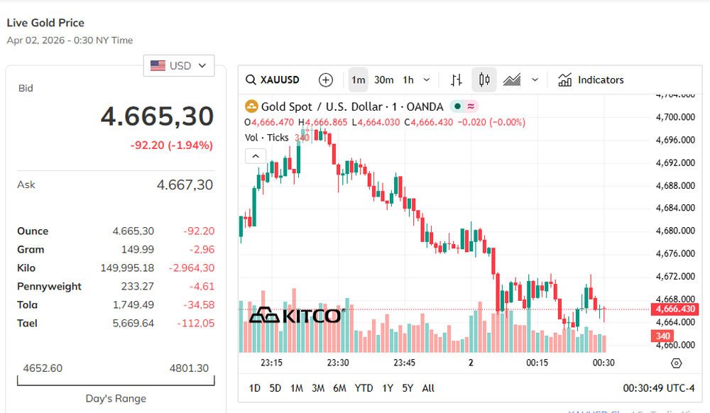 Lúc 11h30 (theo giờ Việt Nam), giá vàng giao ngay trên thị trường quốc tế ở mức 4.650 USD/ounce, giảm 92 USD. Giá vàng giao tháng 5/2026 trên sàn Comex New York ở mức 4.687 USD/ounce.