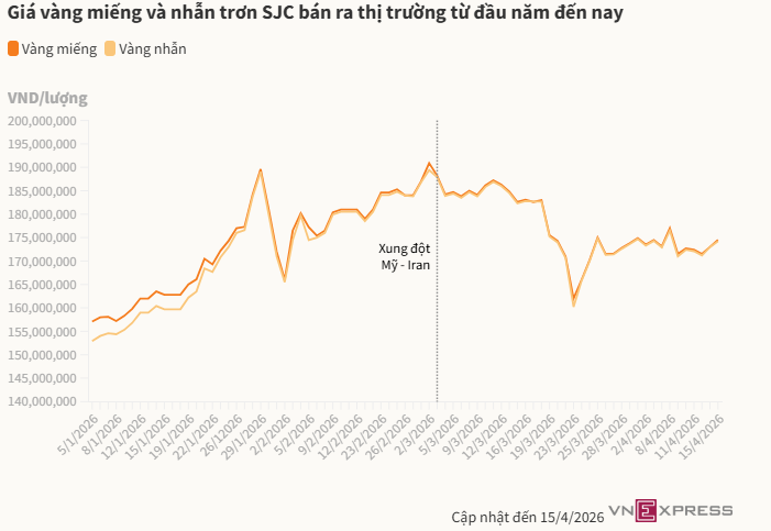 10h ngày 15/4, Công ty Vàng bạc đá quý Sài Gòn (SJC) niêm yết giá vàng miếng tại 171,5 – 174,5 triệu đồng một lượng, tăng 1,5 triệu đồng so với cuối ngày hôm qua. Các thương hiệu khác cũng niêm yết giá vàng miếng tương ứng.