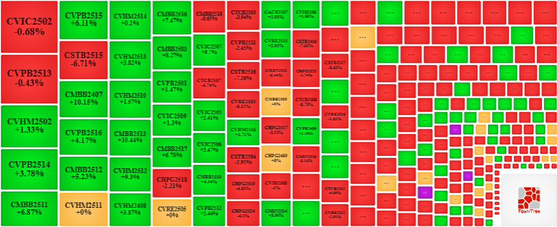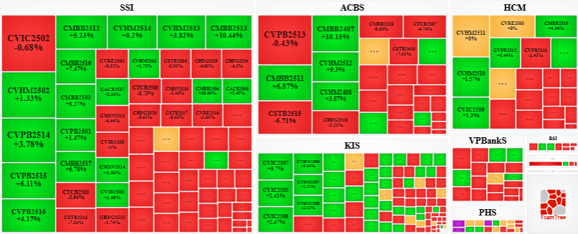 Trong phiên giao dịch ngày 15/08/2025, bên bán quay lại dẫn dắt thị trường khiến phần lớn các mã chứng quyền giảm giá. Cụ thể, các mã chứng quyền lớn trong nhóm giảm giá là CVIC2502, CVPB2513, CSTB2515 và CHPG2518.