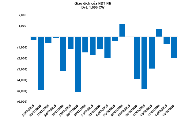 Khối ngoại tiếp tục bán ròng trong phiên 15/08 với tổng mức bán ròng đạt 1.96 triệu CW. Trong đó, CHPG2514 và CVNM2517 là hai mã bị bán ròng nhiều nhất. Tính cho cả tuần, khối ngoại bán ròng hơn 9.69 triệu CW.