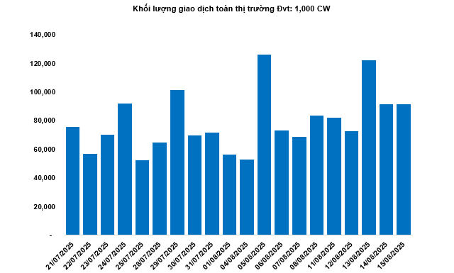 Khối lượng giao dịch toàn thị trường trong phiên 15/08 đạt 91.84 triệu CW, tăng 0.11%; giá trị giao dịch đạt 225.61 tỷ đồng, tăng 5.38% so với phiên 14/08. Trong đó, CHPG2406 là mã dẫn đầu thị trường về khối lượng với 7.05 triệu CW; CHPG2504 dẫn đầu về giá trị giao dịch với 14.13 tỷ đồng.