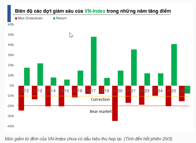 Thị trường chứng khoán Việt Nam đang trải qua chuỗi 10 phiên điều chỉnh trong năm 2026, với mức giảm từ đỉnh (drawdown) đã nới rộng lên trên 15%. Đáng chú ý, tính đến hết phiên 20/03, mức giảm chưa có dấu hiệu thu hẹp mà vẫn tiếp tục mở rộng, phản ánh lực cầu bắt đáy chưa đủ mạnh để tạo điểm cân bằng