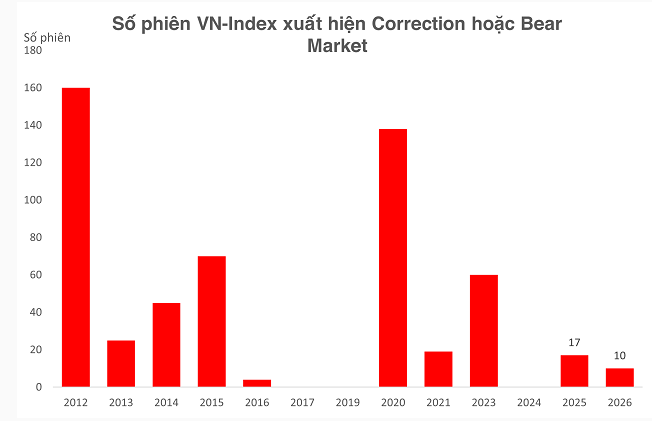 Với trạng thái hiện tại, nhịp điều chỉnh năm 2026 đã đi qua gần 60% về mặt thời gian so với giai đoạn năm 2025, nhưng diễn biến phục hồi chưa xuất hiện rõ ràng.