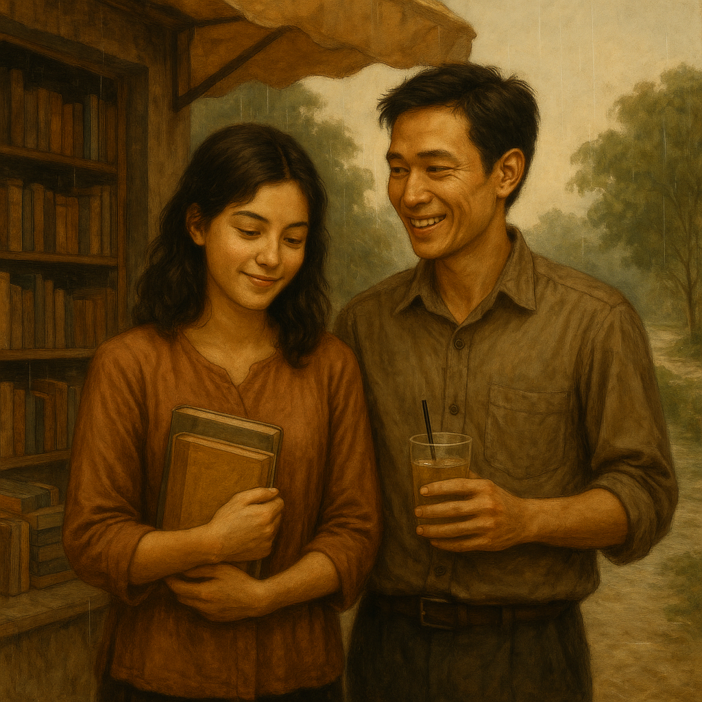 Rồi ông gặp Mai – cô gái bán sách cũ ở góc công viên Hòa Bình. Mái tóc lúc nào cũng buộc vội sau gáy, áo sơ mi bạc màu, nhưng đôi mắt sáng rỡ như chứa cả bầu trời tháng Ba. Cô thích đọc sách cũ, nhất là tiểu thuyết của Tự Lực Văn Đoàn. Còn ông thì hay ghé ngang mỗi chiều tan ca, vừa đi phụ hồ xong, mặt còn lấm lem bụi vôi.
