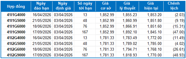 Các hợp đồng tương lai VN30 đồng loạt giảm điểm trong phiên giao dịch ngày 02/04/2026. Cụ thể, 41I1G4000 (I1G4000) giảm 1.2%, còn 1,853.2 điểm; 41I1G5000 (I1G5000) giảm 1.48%, còn 1,851.8 điểm; hợp đồng 41I1G6000 (I1G6000) giảm 1.4%, còn 1,851.6 điểm; hợp đồng 41I1G9000 (I1G9000) giảm 1.41%, còn 1,845.1 điểm. Chỉ số cơ sở VN30-Index kết phiên ở mức 1,852.99 điểm.