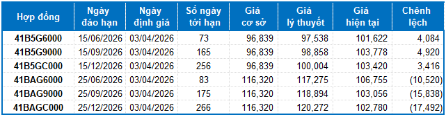 Dựa trên phương pháp định giá hợp lý với thời điểm khởi đầu ngày 03/04/2026, khung giá hợp lý của các hợp đồng tương lai đang được giao dịch trên thị trường được thể hiện như sau: