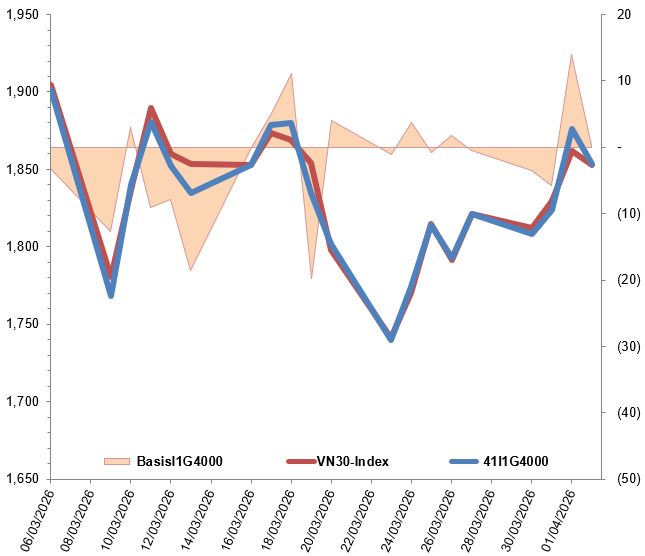 Trong phiên giao dịch ngày 02/04/2026, hợp đồng 41I1G4000 giảm mạnh ngay từ đầu phiên và chuyển sang trạng thái giằng co với lợi thế nghiêng về phía phe Short trong suốt phiên sáng. Bước sang phiên chiều, hợp đồng đi ngang trước khi lực mua xuất hiện trở lại vào cuối phiên giúp hợp đồng này thu hẹp đà giảm. Kết phiên, I1G4000 đóng cửa tại mốc 1,853.2 điểm, giảm 22.6 điểm so với phiên trước.