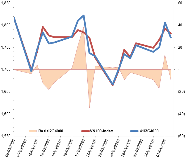 Ngoài ra, các hợp đồng tương lai VN100 đồng loạt giảm điểm trong phiên giao dịch ngày 02/04/2026. Cụ thể, 41I2G4000 (I2G4000) giảm 1.86%, còn 1,772 điểm; 41I2G5000 (I2G5000) giảm 1.24%, còn 1,785 điểm; hợp đồng 41I2G6000 (I2G6000) giảm 2.2%, còn 1,768.1 điểm; hợp đồng 41I2G9000 (I2G9000) giảm 1.67%, còn 1,770 điểm. Chỉ số cơ sở VN100-Index kết phiên ở mức 1,781.33 điểm.