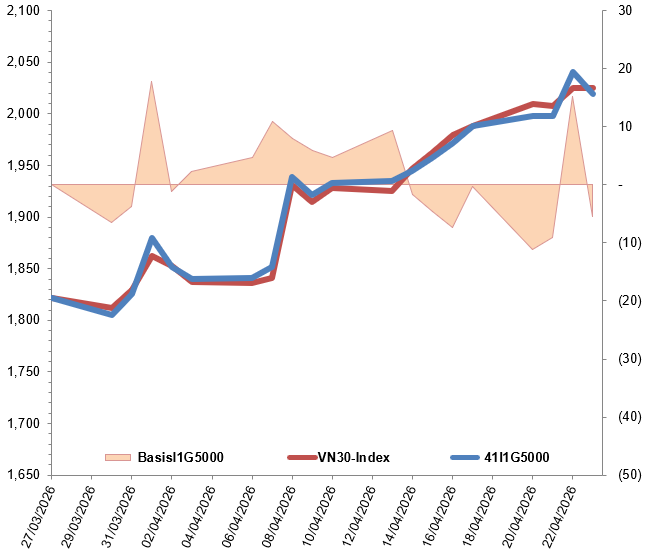 Các hợp đồng tương lai VN30 hầu hết đều giảm trong phiên giao dịch ngày 23/04/2026. Cụ thể, 41I1G5000 (I1G5000) giảm 1.05%, còn 2,019.2 điểm; 41I1G6000 (I1G6000) giảm 0.99%, còn 2,017.9 điểm; hợp đồng 41I1G9000 (I1G9000) giảm 0.87%, còn 2,019.1 điểm; hợp đồng 41I1GC000 (I1GC000) tăng 0.97%, đạt 2,024.9 điểm. Chỉ số cơ sở VN30-Index kết phiên ở mức 2,024.74 điểm.