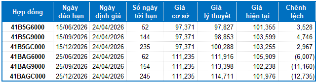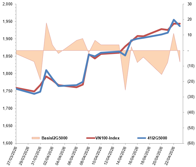 Ngoài ra, Các hợp đồng tương lai VN100 hầu hết đều giảm trong phiên giao dịch ngày 23/04/2026. Cụ thể, 41I2G5000 (I2G5000) tăng 0.14%, đạt 1,936.7 điểm; 41I2G6000 (I2G6000) giảm 1.52%, còn 1,919.5 điểm; hợp đồng 41I2G9000 (I2G9000) giảm 2.15%, còn 1,912 điểm; hợp đồng 41I2GC000 (I2GC000) giảm 2.31%, còn 1,927 điểm. Chỉ số cơ sở VN100-Index kết phiên ở mức 1,944.05 điểm.