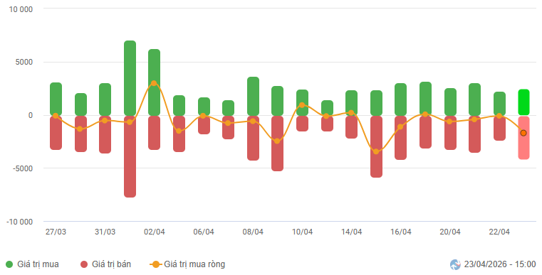 Biến động của dòng tiền từ khối ngoại: Khối ngoại bán ròng trong phiên giao dịch ngày 23/04/2026. Nếu nhà đầu tư nước ngoài duy trì hành động này trong những phiên tới thì áp lực điều chỉnh có thể gia tăng.