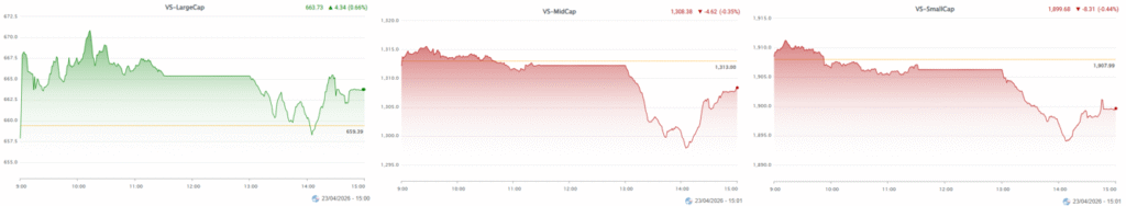 – Diễn biến các nhóm vốn hóa vẫn cho thấy sự lệch pha rõ rệt khi VS-LargeCap tăng 0.66%, tiếp tục đóng vai trò giữ nhịp cho chỉ số chung. Ngược lại, VS-MidCap và VS-SmallCap lần lượt giảm 0.35% và 0.44%, phản ánh áp lực bán lan rộng ở phần lớn cổ phiếu ngoài nhóm dẫn dắt.