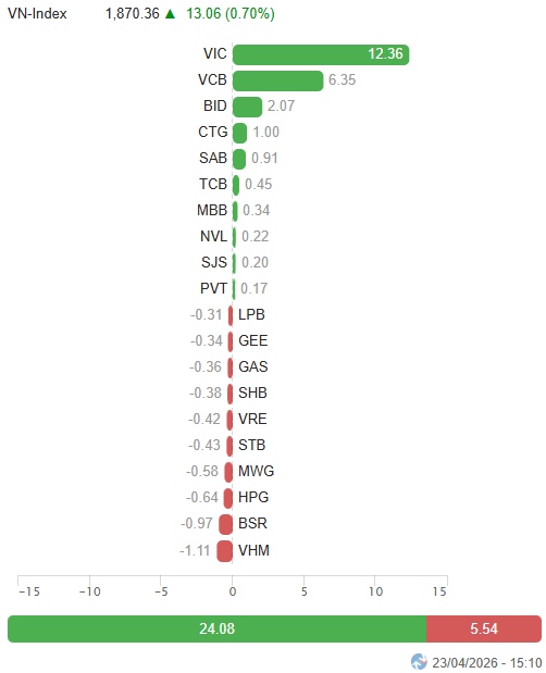 – VN-Index mở cửa phiên 23/04 trong trạng thái tích cực khi lực kéo tập trung ở VIC và nhóm ngân hàng nhanh chóng đưa chỉ số tiến sát ngưỡng 1,890 điểm. Dù đang quay về vùng đỉnh cũ, “cuộc vui” vẫn chỉ dành cho số ít khi sắc đỏ chiếm ưu thế áp đảo ở phần còn lại của thị trường. Thậm chí, áp lực bán gia tăng rõ rệt khi bước sang phiên chiều và nhanh chóng lan rộng ra nhiều nhóm ngành, kéo mặt bằng giá suy yếu đáng kể. Dù vậy, lực đỡ từ nhóm cổ phiếu trụ vẫn đủ mạnh để giúp VN-Index neo giữ sắc xanh, đóng cửa tại 1,870.36 điểm, tăng 0.7% so với phiên trước.