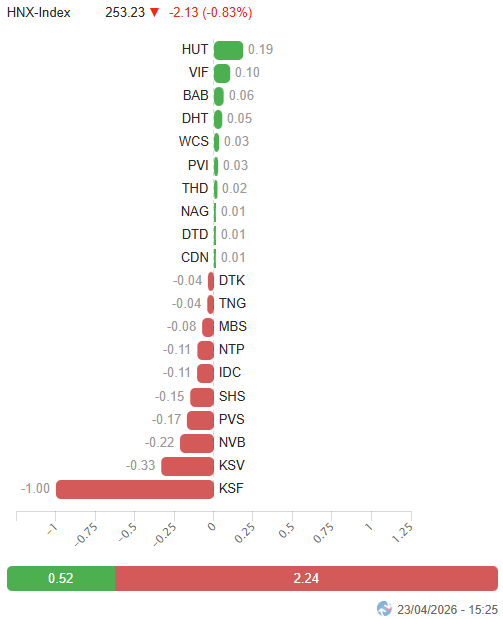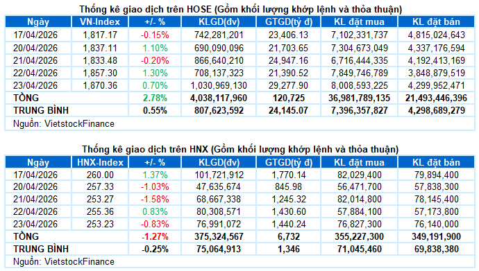 – Các chỉ số chính tăng giảm trái chiều trong phiên giao dịch ngày 23/04. VN-Index tăng 0.7%, lên mức 1,870.36 điểm. Trong khi đó, HNX-Index giảm 0.83%, xuống còn 253.23 điểm.