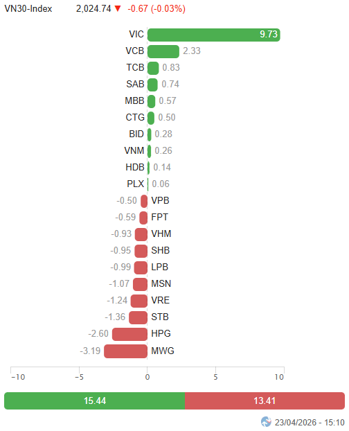 – VN30-Index kết phiên ngay dưới mốc tham chiếu tại 2,024.74 điểm. Độ rộng rổ nghiêng về bên bán với 19 mã giảm, 10 mã tăng và 1 mã đứng giá. VRE là mã điều chỉnh mạnh nhất khi mất 3%, cùng SHB, DGC và MWG cũng đồng loạt giảm hơn 2%. Ở chiều ngược lại, SAB tạo điểm nhấn với sắc tím nổi bật, bên cạnh VCB, VIC và BID cũng ghi nhận mức tăng trên 3%.