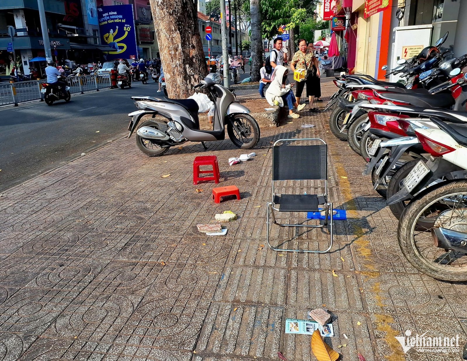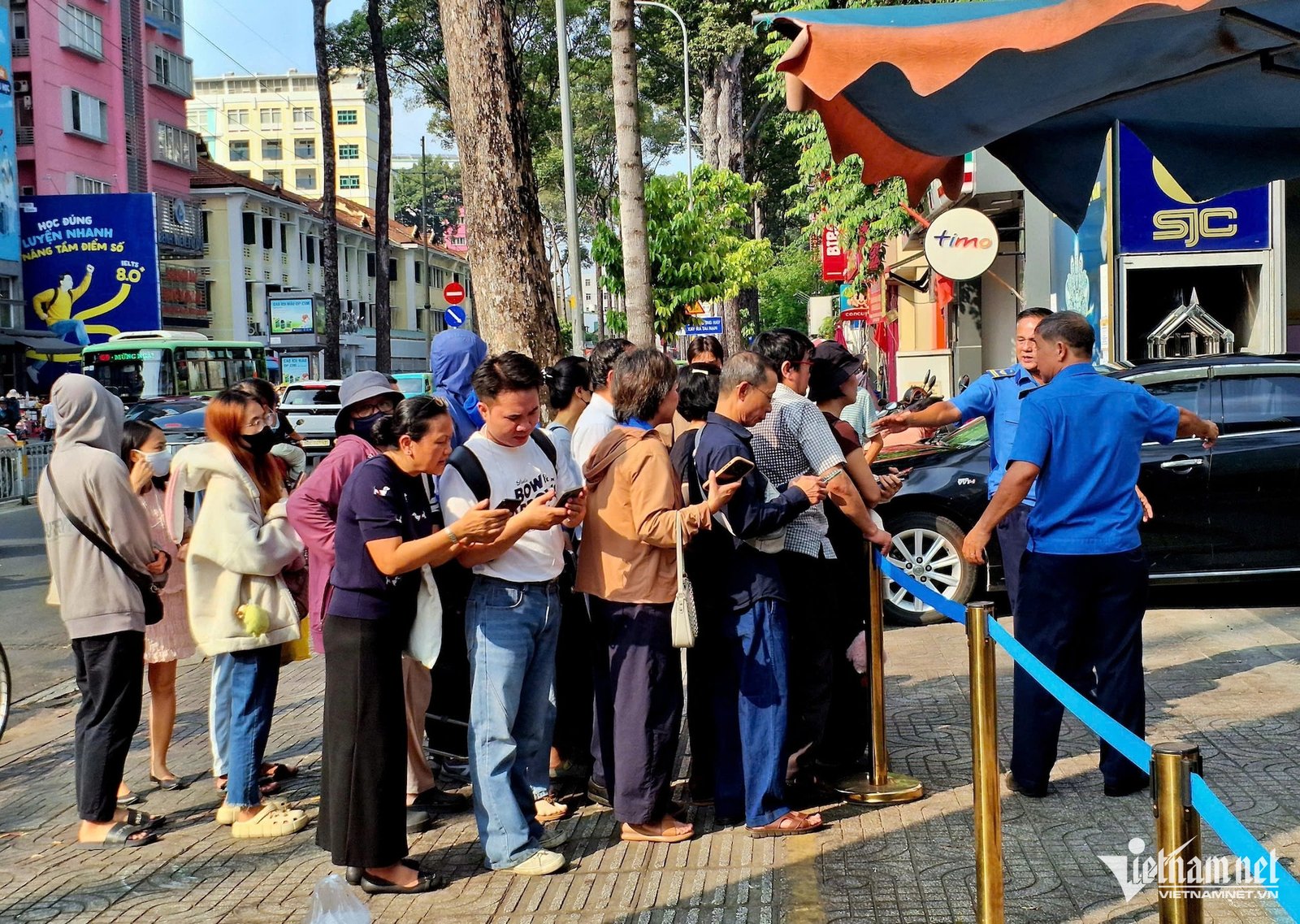 Tại Công ty TNHH MTV Vàng bạc Đá quý Sài Gòn – SJC (phường Bàn Cờ, TPHCM), lúc 8h, khoảng 20 người đã có mặt để xếp hàng chờ đợi mua vàng. Chỗ ngồi trên vỉa hè cũng được xếp “lốt” thứ tự bằng gạch, ghế và vật dụng cá nhân.