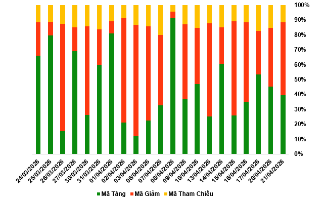 Kết thúc phiên giao dịch ngày 21/04/2026, toàn thị trường có 105 mã tăng, 131 mã giảm và 30 mã tham chiếu.